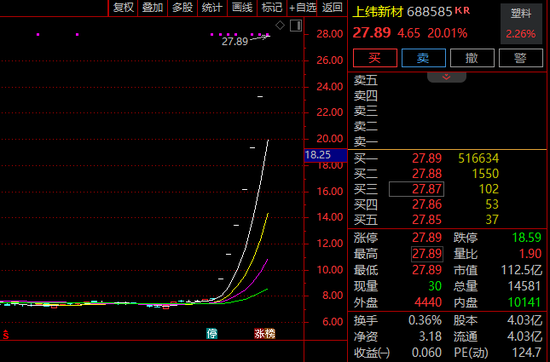 7家公司中,上纬新材(688585)股价表现“一骑绝尘”,7月9日复牌以来已连续收获7个20cm涨停板,7日累计涨幅258.48%,最新市值升至112亿元,颇受市场关注。