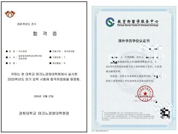 韩国庆熙大学录取通知及中留服国外学历学位认证书样本