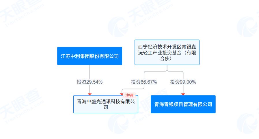 不过,《每日经济新闻》记者查询天眼查发现,青海青银成立于2024年,西宁经济技术开发区青银鑫沅轻工产业投资基金(有限合伙)(以下简称“西宁青银基金”)为其控股股东,持股比例为99%。而西宁青银基金及中利集团又均为青海中盛光通讯科技有限公司(以下简称“青海中盛”)的持股股东。其中,西宁青银基金持有青海中盛股份的比例为66.67%;中利集团的持股比例为29.54%。2018年5月15日,青海中盛被注销。